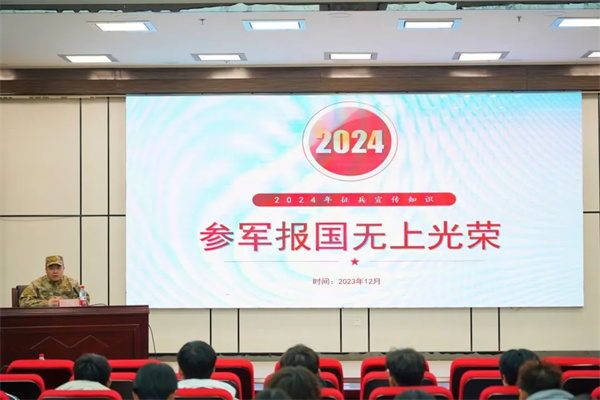 为扎实做好米乐官网2024年春季征兵宣传工作,充分发挥高校主阵地作用,营造参军报国的浓厚氛围,使米乐官网学生更好地了解征兵各项政策,12月21日,米乐官网学生工作部征兵工作站在学术报告厅开展2024年春季征兵政策宣讲活动。内蒙古自治区呼和浩特市玉泉区人民武装部军事科李永兵参谋参加活动,现场为同学们答疑解惑。